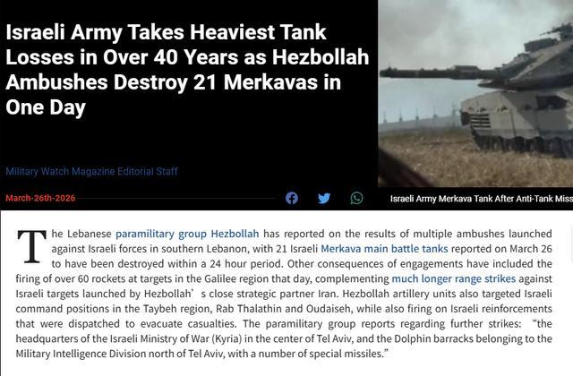 一天被毁21台梅卡瓦!美媒:以军遭遇40年来最大损失,濒临崩溃
