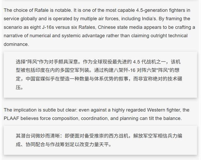 现代空战早就不是比拼单机性能的年代了,体系对抗、信息优势、战术配合缺一不可,虽然不依靠体系我也能赢,但是在体系支撑下我可以赢得更漂亮、尽可能减少损失,就好比抓捕歹徒要出动一队装备精良的特警,绝不是单打独斗赢不了他。解放军这次推演8架歼-16对6架阵风,恰恰是在模拟复杂的多机协同作战,而不是让飞机排队单挑。