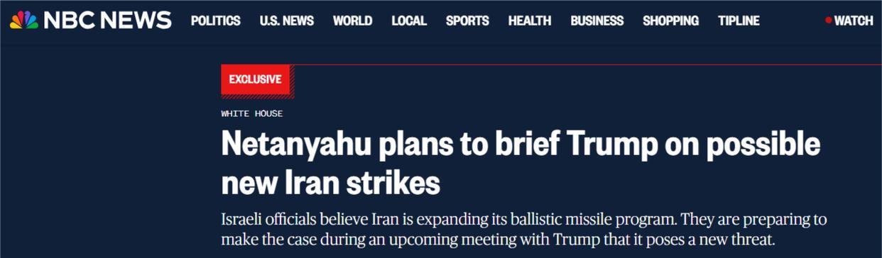 NBC的报道援引知情人士的话说,特朗普与内塔尼亚胡预计将于本月晚些时候举行会晤。内塔尼亚胡届时或将以“伊朗弹道导弹项目的扩张不仅将对以色列构成威胁,也会危及地区安全及美国相关利益”为由,向特朗普提出“美军参与或协助该军事行动”的选项。
