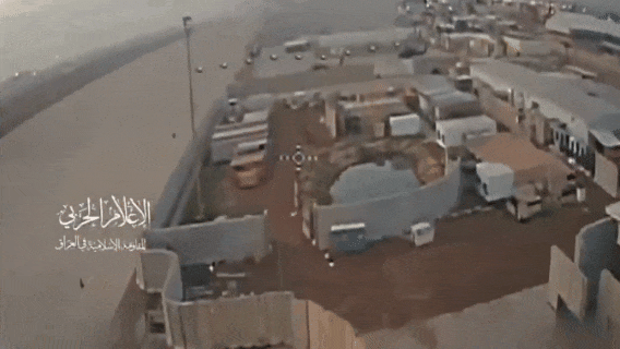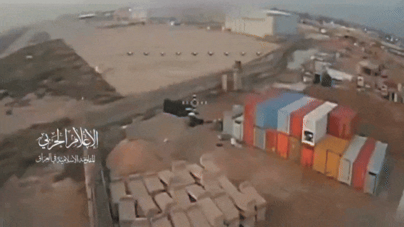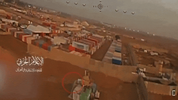 今天我们将两个新闻联系在一起说。首先还是中东战场,3月25日,隶属于伊拉克什叶派民兵武装“人民动员部队”(PMF)旗下的“血卫旅”发布视频,再度证明其在巴格达国际机场附近的美军“胜利营地”内部,使用了FPV型无人机发起攻击。