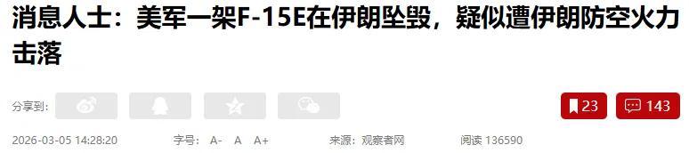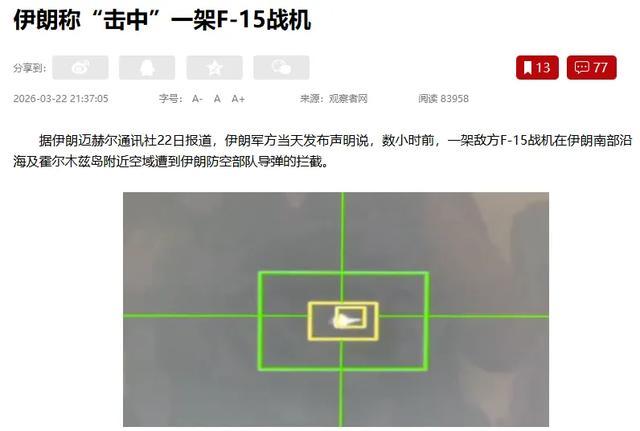 3月22日,伊朗伊斯兰革命卫队官方发布声明,宣称在伊朗南部沿海及霍尔木兹岛附近空域,用防空导弹击中一架美军F-15E,并公布了战机释放干扰弹规避打击的相关视频,美军中央司令部对此事既不确认也不否认,反正就主打一个不吱声。