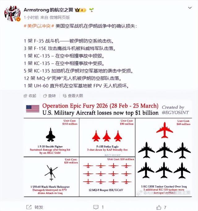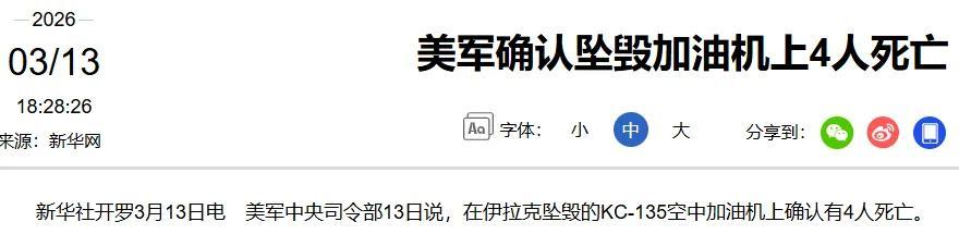 KC-135空中加油机目前是战损六架,坠毁一架,3月12日,1架KC-135空中加油机在伊拉克西部空域执行空中加油任务时失事,一开始说4名人员死亡了,之后更新为机上6人全部死亡。