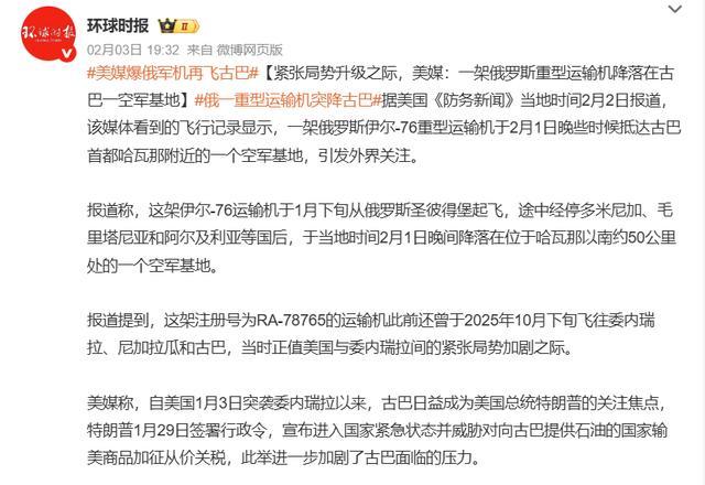 在成功突袭委内瑞拉后,特朗普政府又瞄上了古巴,最终在1月末将语言威胁,转变为“向对古巴提供石油的国家加征关税”。尽管目前还没有发展到武力威慑阶段,但有委内瑞拉的前车之鉴,古巴也不得不重视这份威胁。2月3日,多方消息证实,一架从圣彼得堡出发的伊尔-76TD运输机,经数次中转后降落哈瓦那。
