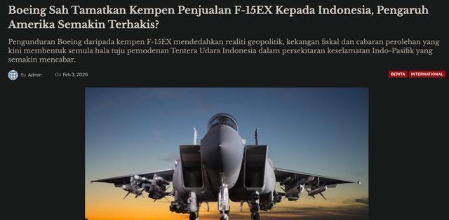 据《防务亚洲》2月4日报道,波音公司国防业务发展与战略副总裁皮特斯在2026年新加坡航展上透露,向印尼出售F-15EX战机的计划已经终止。据了解,这笔订单价值高达139亿美元,涵盖24架F-15EX战机及相关的培训、后勤支持,双方此前已经签署了合作备忘录。这么好的生意,当然不会是波音主动放弃了,而是因为印尼不想买了。F-15EX号称“最强非隐身战机”,但其单机全寿命周期成本已经逼近甚至超过了F-35,虽然我叫印度尼西亚,但你不能真把我当成印度耍啊。说白了,F-15EX本质上就是一款基于冷战设计理念的拉皮机型,虽然堆砌了新的电子战系统和导弹挂架,但它终究没有隐身能力。花比F-35还贵的钱买一款注定要过时的四代半战机,这纯粹是交保护费。