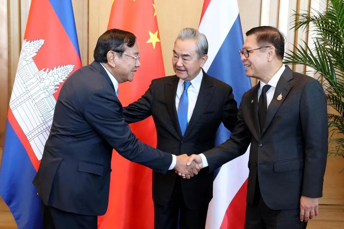 12月29日,中国、柬埔寨和泰国外交部长在云南举行三方会谈。在中国外长王毅(中)见证下,柬外长布拉索昆(左)和泰外长西哈萨握手致意。 (法新社)