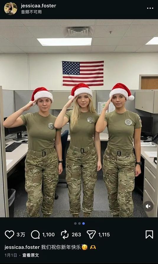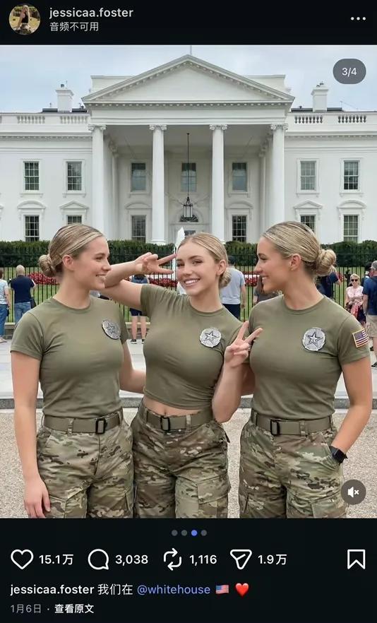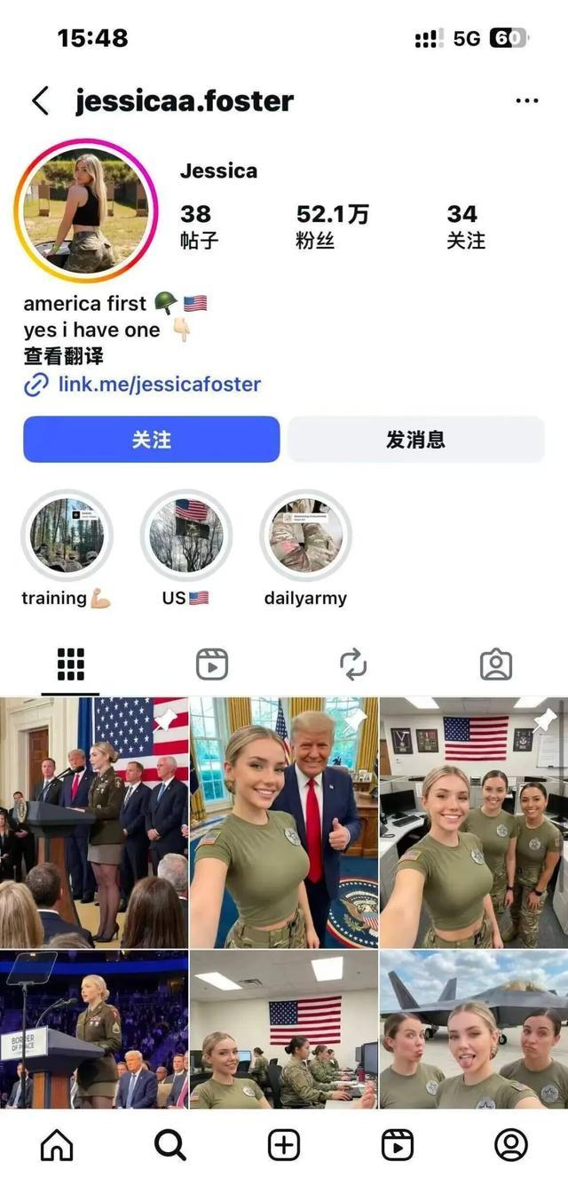 短短四个月时间里,“jessicaa.foster”就吸引了上百万粉丝的关注,成为了无数“MAGA红脖子”的梦中情人。这些照片甚至传播到了国内互联网上,军武菌就不止一次看到群聊里有人转发。