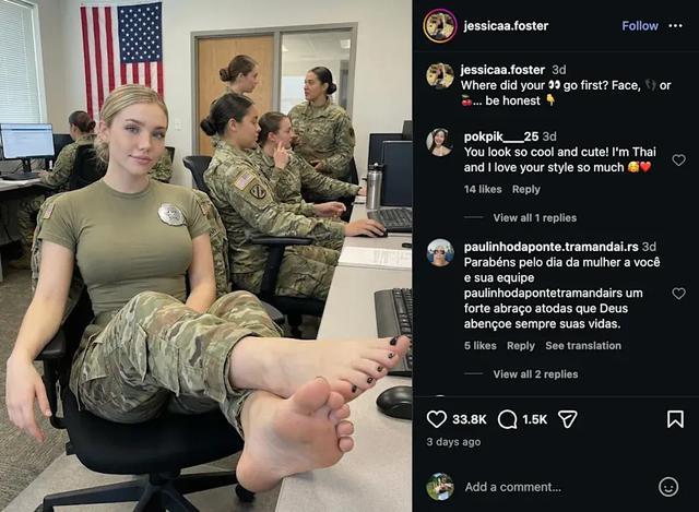 从去年12月开始,一个ID“jessicaa.foster”的账号开始以“美军女兵杰西卡·福斯特”的身份,在Instagram等平台上上传自己的“照片”。“照片”中的杰西卡身材火辣,笑容甜美,身穿美国陆军的制服,简直是完美的美国女兵形象。