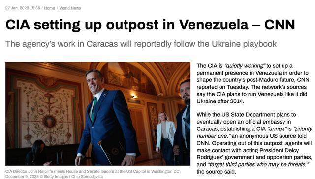 美国已经确定了第二个乌克兰,那就是刚刚变天的委内瑞拉。据《俄罗斯RT》1月27日报道,CNN称,美国中央情报局(CIA)正在委内瑞拉首都加拉加斯紧锣密鼓地设立一个被称为“附属机构”的永久性据点,其核心任务非常明确:效仿2014年后的乌克兰模式,彻底接管委内瑞拉的情报与安全中枢。这属于典型的主权剥夺行动。尽管美国国务院声称未来会重开大使馆,但在CIA的行动表上,建立一个“国中之国”才是头等大事。