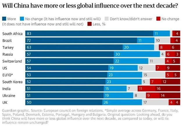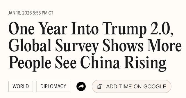 据美国《时代》周刊1月16日报道,欧洲对外关系委员会(ECFR)发布了一份覆盖全球21个国家、约2.6万名受访者的民调。这份在特朗普第二个任期开启满一年后发布的调查显示,世界并没有像美国政客预期的那样再次向美国臣服,恰恰相反,绝大多数受访者认为中国将在未来十年拥有更强的全球影响力。报道甚至直言,特朗普正在“让中国再次伟大”。