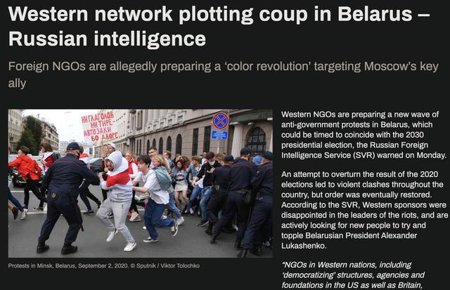 据《俄罗斯RT》2月9日报道,俄罗斯对外情报局称,西方情报机构与各类非政府组织(NGO)正在紧锣密鼓地进行资产盘点,以便在2030年白俄罗斯总统大选期间引爆新一轮的颜色革命。2020年时,白俄罗斯就爆发过大规颜色革命,西方一度看到了成功的曙光。当时的骚乱与传统的颜色革命不太一样,属于一场混合战争。西方情报机构并没有直接向街头输送武器,而是利用社交软件作为远程指挥中枢,对数十万抗议者实时操控。