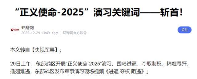 在12月29日,在毫无预兆的情况下,解放军东部战区突然启动了“正义使命-2025”演习。根据复旦大学教授沈逸的说法,有网友进行了地图作业测算,发现解放军这次的台海演练区域,距离台岛最近只有4.7海里。这也意味着,岛内赖清德之流曾多次提到的所谓“海峡中线”“24海里线”“12海里线”已经被全部抹除。而4.7海里的距离,也说明解放军距离登岛只差一步,可能下一次就是直接进行“雷霆一击”。尤其是东部战区发布演习现场视频时,还特意提到了一个关键词“斩首”,这说明解放军随时都可能发起行动,精准制裁“台独”首恶分子。台军“退将”栗正杰则认为,这次解放军的行动,就是一次标准的“突袭”。