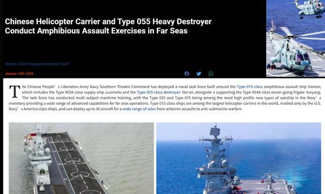 去年末,南部战区海南舰曾在延安舰等舰艇支援下,南下逼近澳大利亚,随后又在月末北上,代替山东舰参加了多兵种联合军演。半个多月后,官方终于放出了编队海上航行资料,美国“Military Watch”网站敏锐观察到这一点,并顺势给出了评价——预计到2030年美国两栖舰队就要被中国超越了。