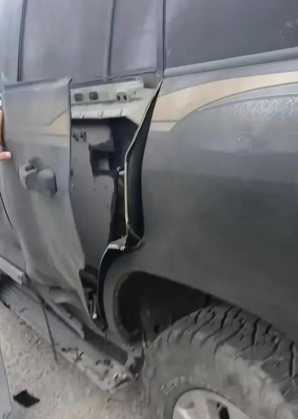 首先可以确认的是,从视频上来看,这发火箭弹肯定不是哑弹。命中车辆后,火箭弹是当场爆炸,产生了巨大的火光和烟尘。虽然在视频里,这辆越野车好像什么事也没有,还能加速逃离现场,但事后的照片上可以看出,这发火箭弹应当是直接命中了汽车的左侧车门下沿,打爆了前后轮胎,并且对车体后部造成了显著破坏。