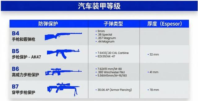 根据标准,BR4等级的防弹车可以阻挡冲锋枪的直射,BR5的防弹车可以阻挡AK-47的直射,而BR6的防弹车能够挡住全威力步枪弹的直射。至于最高等级的BR7,必须要能够挡住.30-06口径穿甲弹的直接射击才行。